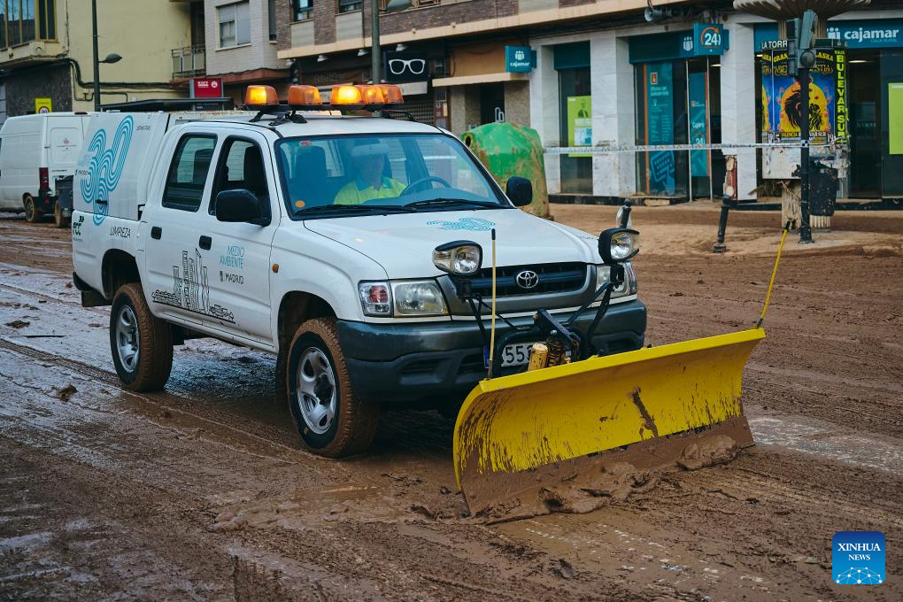 A vehicle cleans up a flood-hit area in Valencia, Spain, Nov. 1, 2024. Spain remains deeply shaken by the deadly flash floods that have left 205 people confirmed dead and wrecked havoc across the regions of Valencia, Castilla-La Mancha and Andalusia in the east and southeast parts of the country. As of Friday, many more are still unaccounted for. (Photo by Pablo Morano/Xinhua)