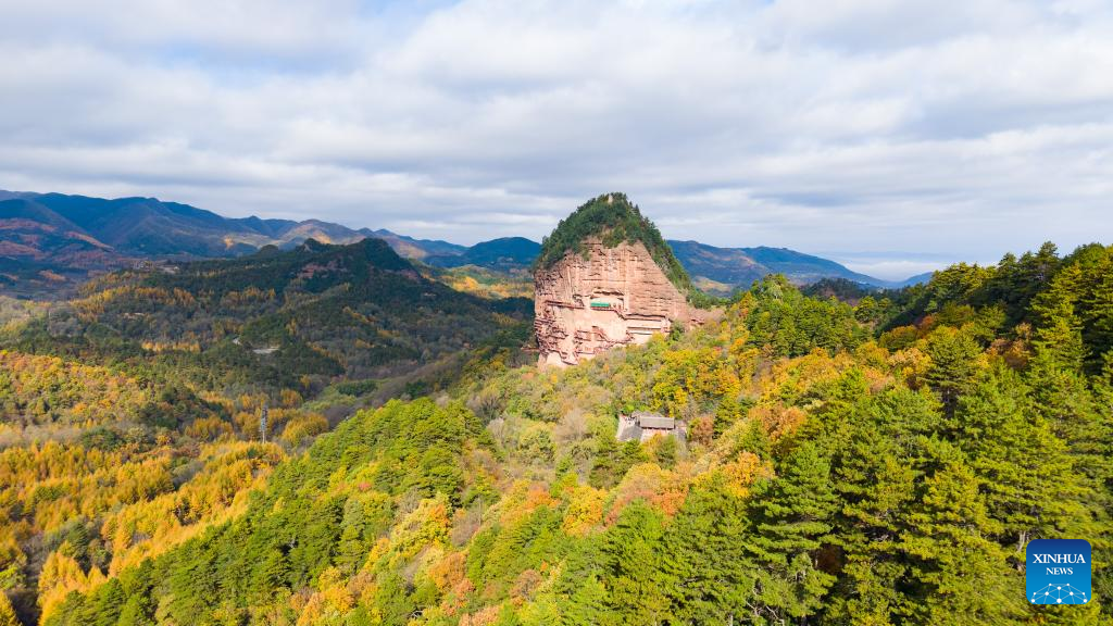 A panoramic drone photo taken on Nov. 2, 2024 shows a view of the Maiji Mountain Grottoes in Maiji District of Tianshui City, northwest China's Gansu Province. The Maiji Mountain Grottoes is one of the four most famous grottoes in China. In the past three years, 29 caves here have been protected and reinforced as Maiji Mountain Grottoes art institute and other cultural relics protection organizations have employed scientific and technological methods to ensure the grottoes remain well-preserved. (Xinhua/Lang Bingbing)