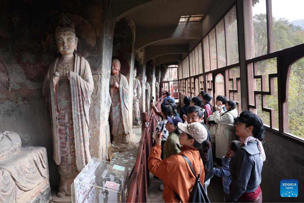 Tourists visit the Maiji Mountain Grottoes in Maiji District of Tianshui City, northwest China's Gansu Province on Nov. 2, 2024. The Maiji Mountain Grottoes is one of the four most famous grottoes in China. In the past three years, 29 caves here have been protected and reinforced as Maiji Mountain Grottoes art institute and other cultural relics protection organizations have employed scientific and technological methods to ensure the grottoes remain well-preserved. (Xinhua/Chen Bin)