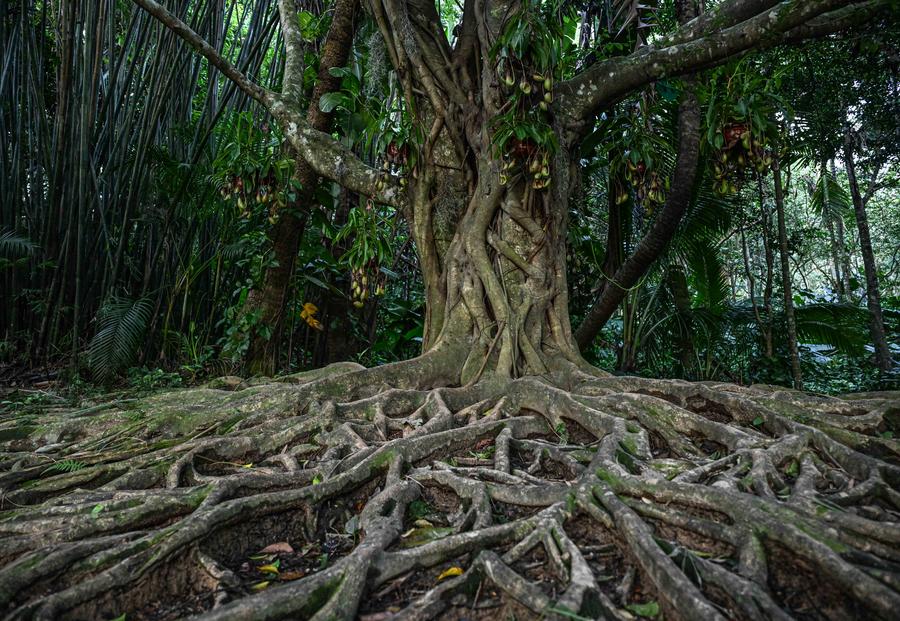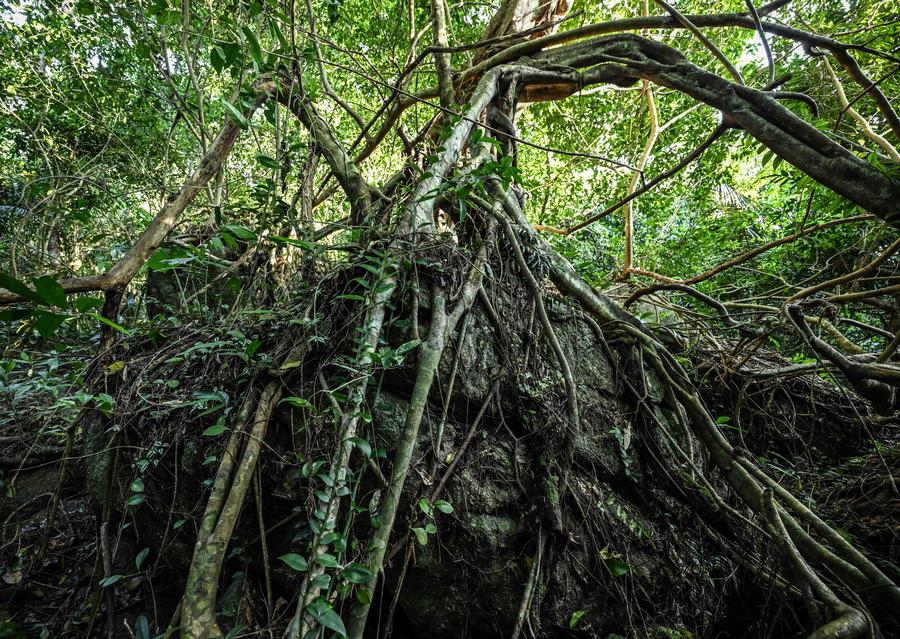 This photo taken on Nov. 1, 2024 shows tree roots wrapping around a stone at the Yanoda Rain Forest Cultural Tourism Zone in Baoting Li and Miao Autonomous County, south China's Hainan Province. (Xinhua/Pu Xiaoxu)