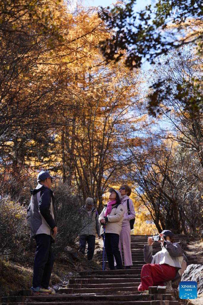 The autumn scenery of the Yading scenic spot in Daocheng County of Tibetan Autonomous Prefecture of Garze is at peak recently, attracting tourists to explore its beauty.