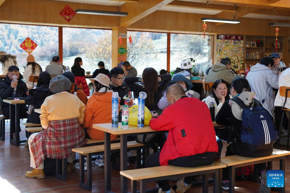 Tourists take a rest at a service station of Yading scenic spot in Daocheng County of Tibetan Autonomous Prefecture of Garze, southwest China's Sichuan Province, Oct. 31, 2024. (Xinhua/Xu Bingjie)