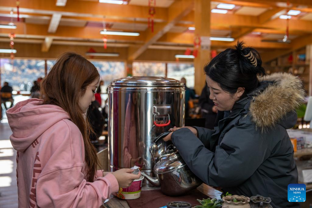 A staff member provides hot water to a tourist at a service station of Yading scenic spot in Daocheng County of Tibetan Autonomous Prefecture of Garze, southwest China's Sichuan Province, Oct. 31, 2024. (Xinhua/Chu Jiayin)