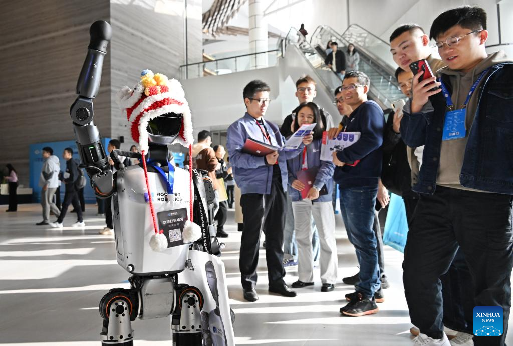 Participants look at a robot at the exhibition area of the 2024 China Automation Congress in Qingdao, east China's Shandong Province, Nov. 2, 2024. The 2024 China Automation Congress, which focuses on the deep integration of automation and artificial intelligence as well as explores the innovative development of new industries and technologies, would last from Nov. 1 to Nov. 3 here. (Xinhua/Li Ziheng)
