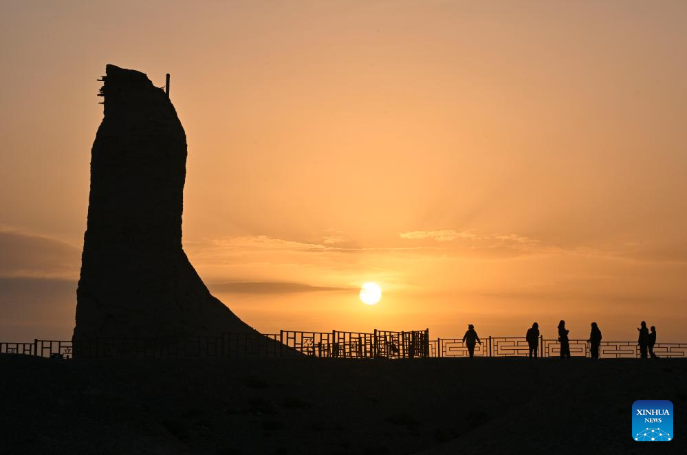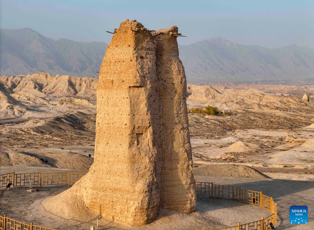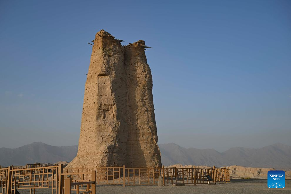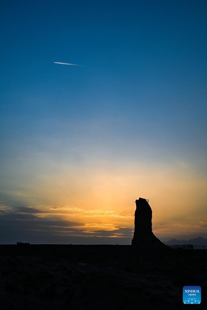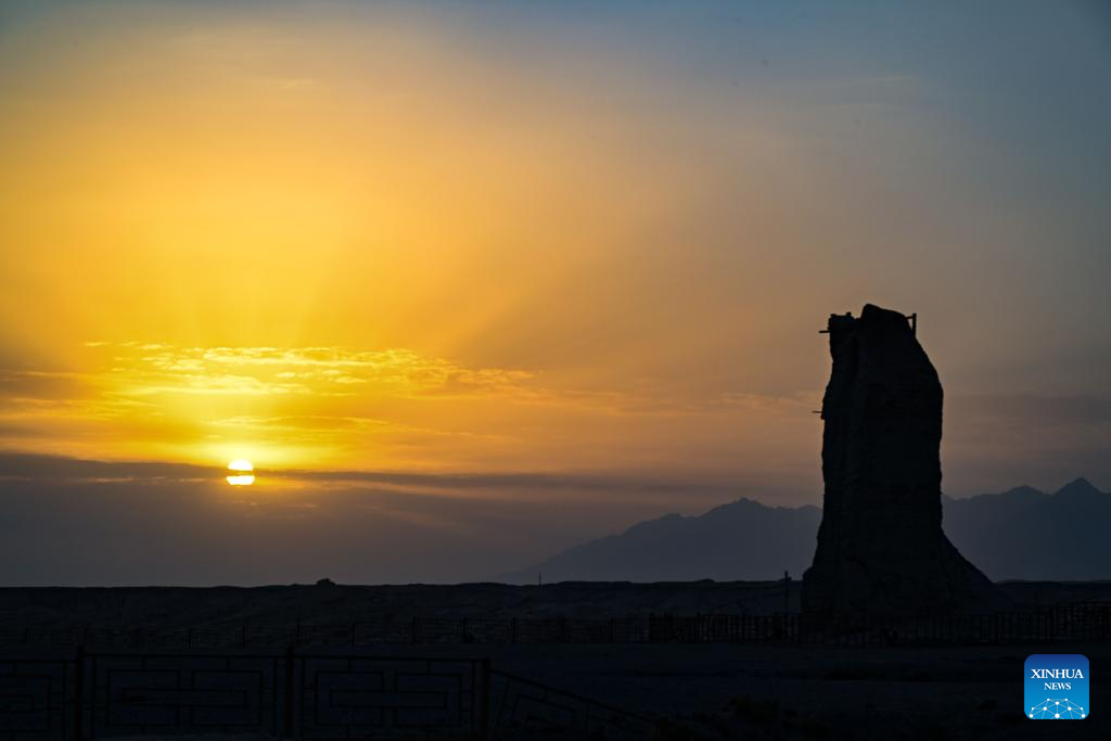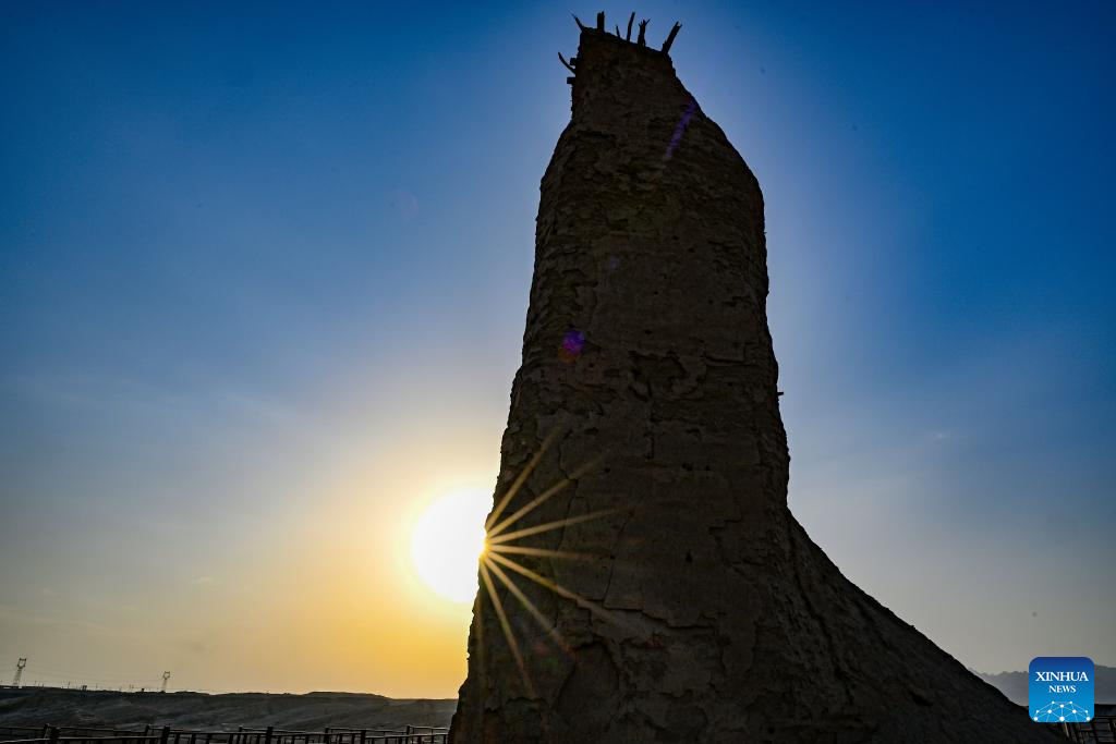 This photo taken on Oct. 31, 2024 shows the Kizilgaha Beacon Tower at sunset in Kuqa City, northwest China's Xinjiang Uygur Autonomous Region. (Xinhua/Hu Huhu)