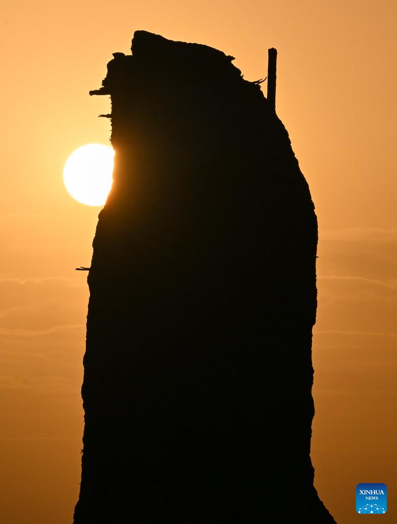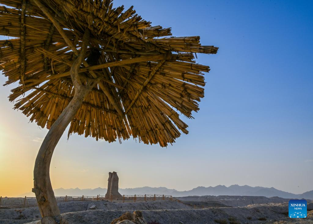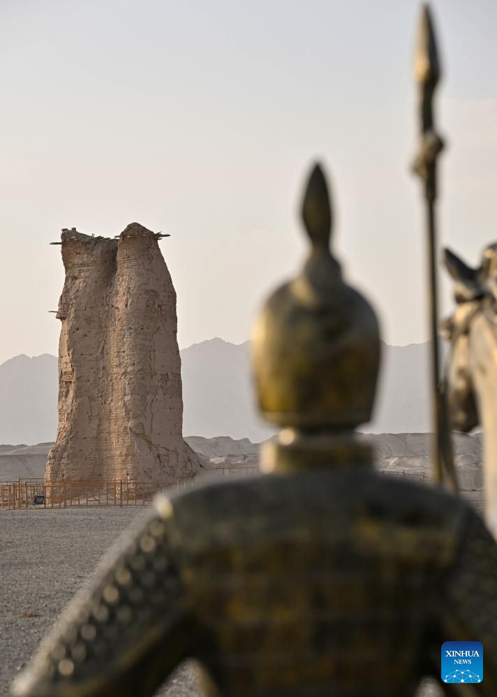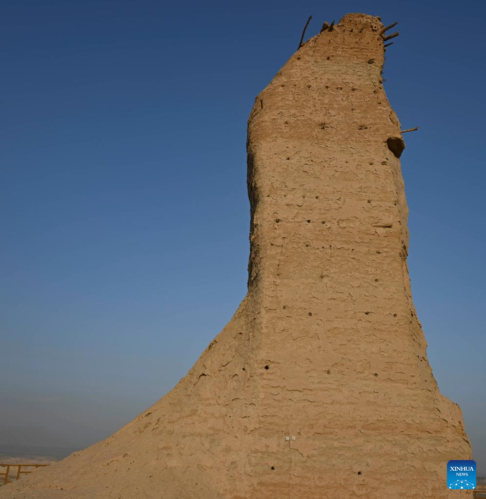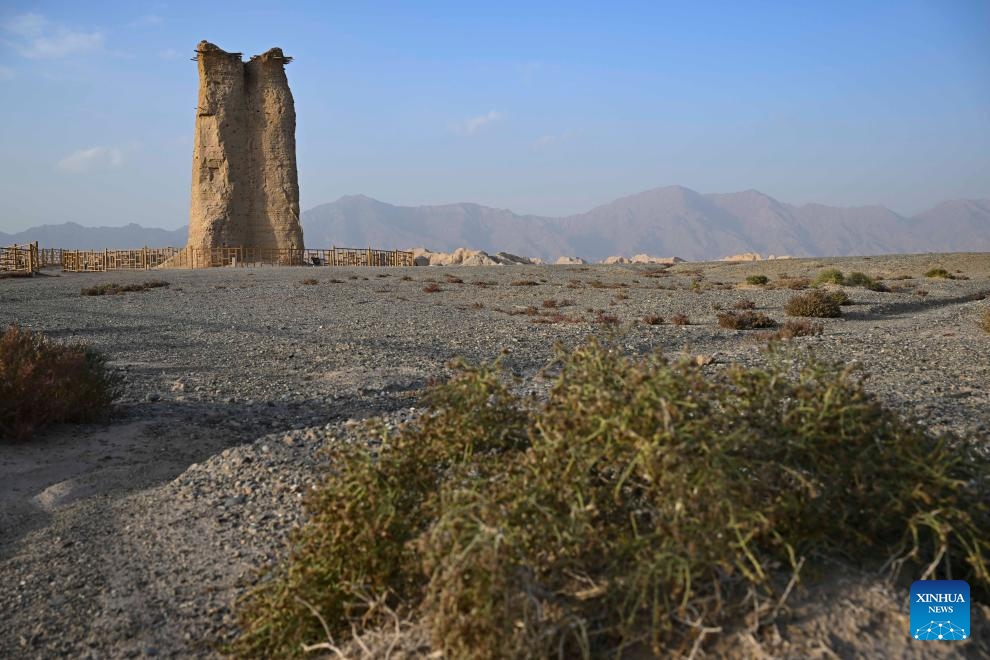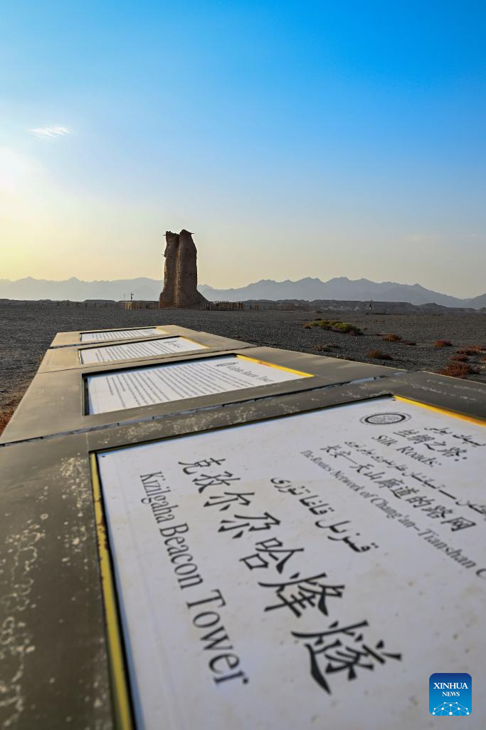 This photo taken on Oct. 31, 2024 shows the Kizilgaha Beacon Tower at sunset in Kuqa City, northwest China's Xinjiang Uygur Autonomous Region. (Xinhua/Hu Huhu)