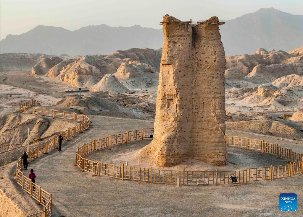 A drone photo taken on Oct. 31, 2024 shows the Kizilgaha Beacon Tower at sunset in Kuqa City, northwest China's Xinjiang Uygur Autonomous Region. (Xinhua/Hu Huhu)