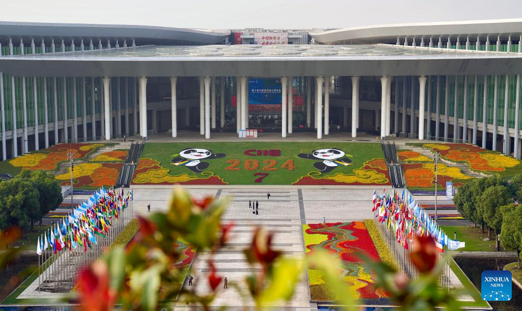 This photo taken on Nov. 2, 2024 shows the south square of the National Exhibition and Convention Center (Shanghai), the main venue for the 7th China International Import Expo (CIIE), in east China's Shanghai. The center has been fully decorated to welcome the upcoming 7th CIIE, which is scheduled to take place in Shanghai from Nov. 5 to Nov. 10. (Xinhua/Liu Ying)
