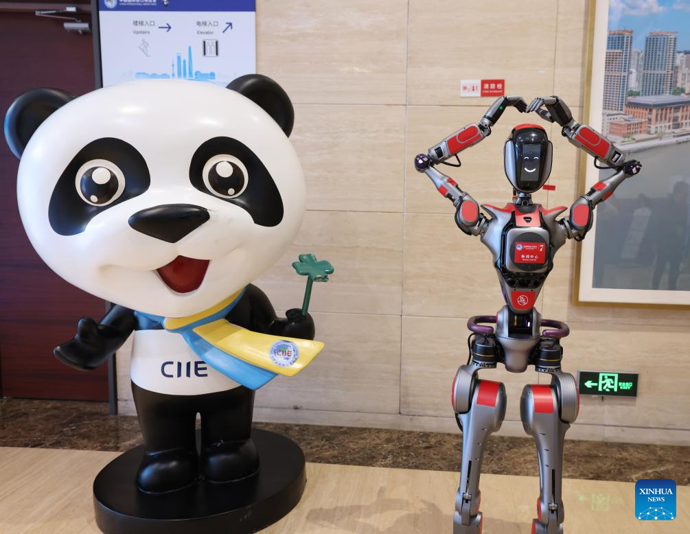 Jinbao, the mascot of the China International Import Expo (CIIE), and Xiaoxin, a humanoid robot providing inquiry service, are pictured at the media center of the 7th CIIE in Shanghai, east China, Nov. 4, 2024. (Xinhua/Yin Gang)
