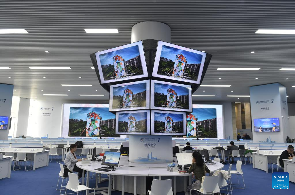 This photo taken on Nov. 4, 2024 shows the media center for the 7th China International Import Expo (CIIE) in Shanghai, east China. The 7th CIIE will be held in Shanghai from Nov. 5 to 10. (Xinhua/Lu Peng)