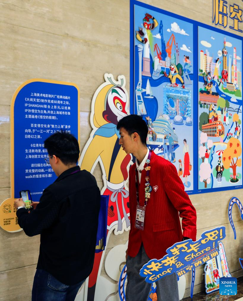 Media workers look at "Wukong's Shanghai Journey," a comic themed on Shanghai, at the media center of the 7th China International Import Expo (CIIE) in Shanghai, east China, Nov. 4, 2024. The 7th CIIE will be held in Shanghai from Nov. 5 to 10. A variety of cultural activities at the media center attracted many media staff. (Photo by Chang Nengjia/Xinhua)