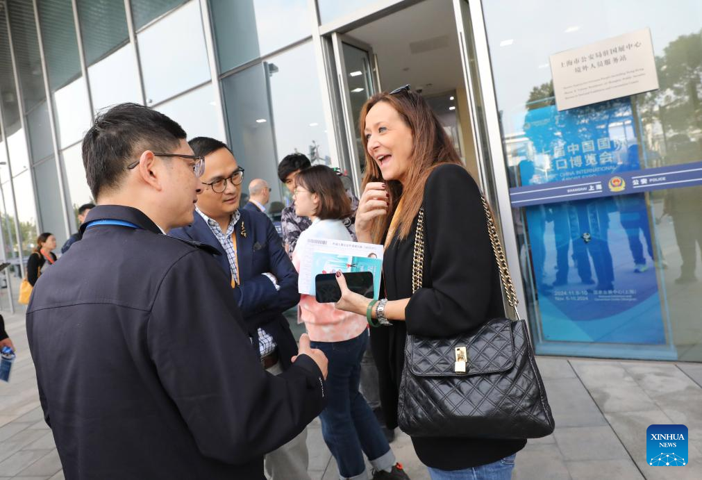 An Italian exhibitor (R) talks with staff members outside the overseas personnel service station for the 7th China International Import Expo (CIIE) in Shanghai, east China, Nov. 4, 2024. The service station opened at the National Exhibition and Convention Center (Shanghai), the main venue for the 7th CIIE, on Monday. Shanghai has introduced a comprehensive range of services to suit the convenience of CIIE participants. (Xinhua/Fang Zhe)
