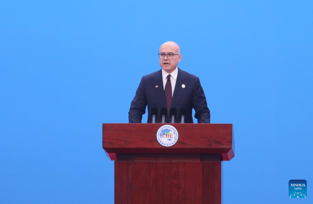 Serbian Prime Minister Milos Vucevic addresses the opening ceremony of the seventh China International Import Expo (CIIE) and the Hongqiao International Economic Forum at the National Exhibition and Convention Center (Shanghai) in east China's Shanghai, Nov. 5, 2024. (Xinhua/Fang Zhe)