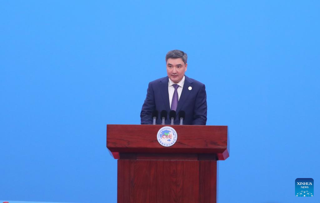 Kazakh Prime Minister Olzhas Bektenov addresses the opening ceremony of the seventh China International Import Expo (CIIE) and the Hongqiao International Economic Forum at the National Exhibition and Convention Center (Shanghai) in east China's Shanghai, Nov. 5, 2024. (Xinhua/Fang Zhe)