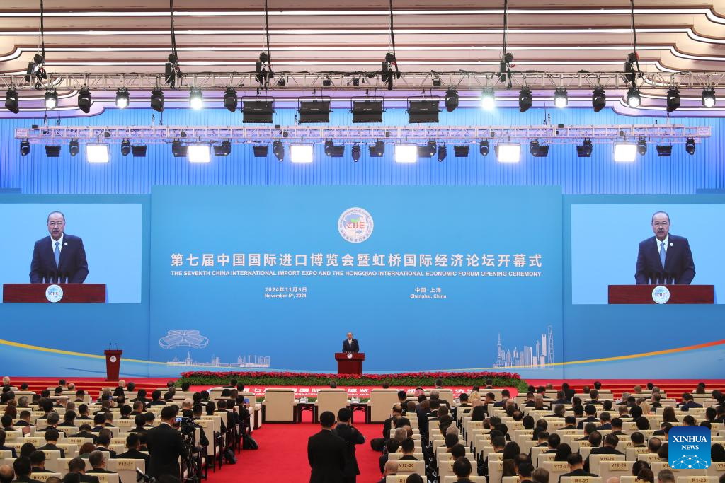 The opening ceremony of the seventh China International Import Expo (CIIE) and the Hongqiao International Economic Forum is held at the National Exhibition and Convention Center (Shanghai) in east China's Shanghai, Nov. 5, 2024. (Xinhua/Yin Gang)