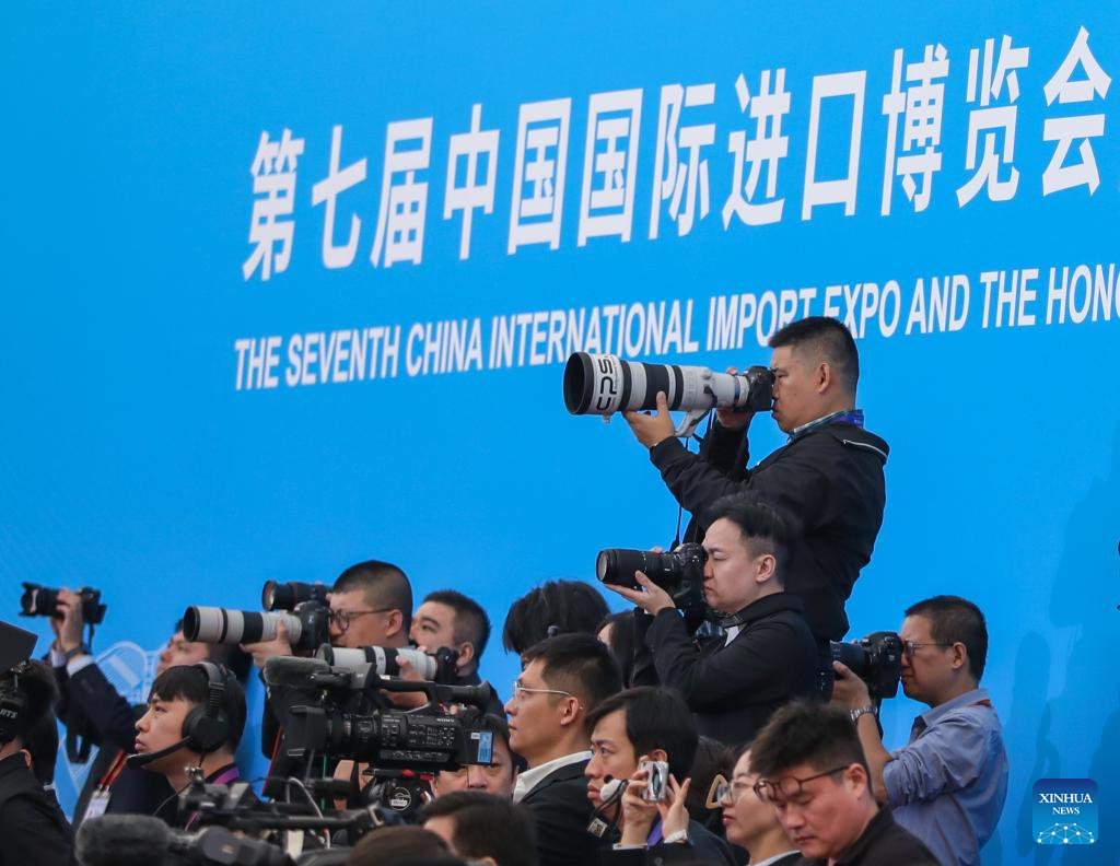 Journalists work during the opening ceremony of the seventh China International Import Expo (CIIE) and the Hongqiao International Economic Forum at the National Exhibition and Convention Center (Shanghai) in east China's Shanghai, Nov. 5, 2024. (Xinhua/Du Xiaoyi)