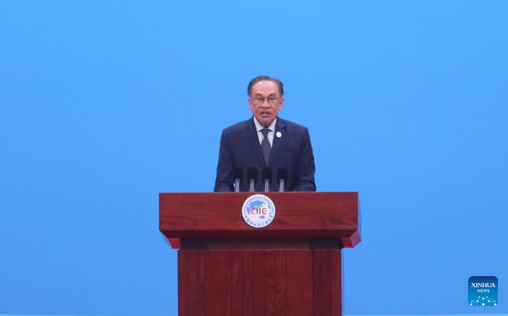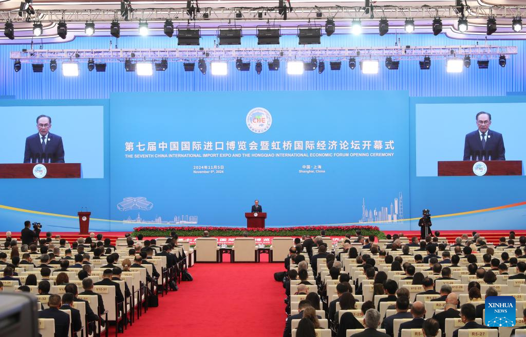 Malaysian Prime Minister Anwar Ibrahim addresses the opening ceremony of the seventh China International Import Expo (CIIE) and the Hongqiao International Economic Forum at the National Exhibition and Convention Center (Shanghai) in east China's Shanghai, Nov. 5, 2024. (Xinhua/Fang Zhe)