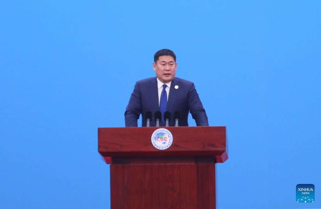 Mongolian Prime Minister Luvsannamsrai Oyun-Erdene addresses the opening ceremony of the seventh China International Import Expo (CIIE) and the Hongqiao International Economic Forum at the National Exhibition and Convention Center (Shanghai) in east China's Shanghai, Nov. 5, 2024. (Xinhua/Fang Zhe)