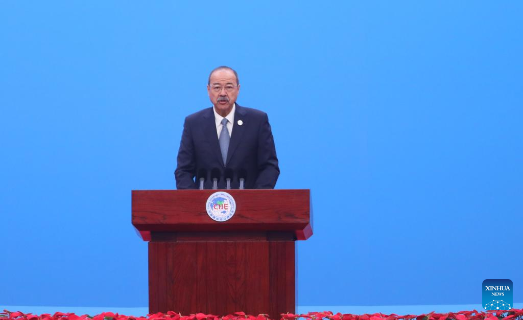 Uzbek Prime Minister Abdulla Aripov addresses the opening ceremony of the seventh China International Import Expo (CIIE) and the Hongqiao International Economic Forum at the National Exhibition and Convention Center (Shanghai) in east China's Shanghai, Nov. 5, 2024. (Xinhua/Fang Zhe)