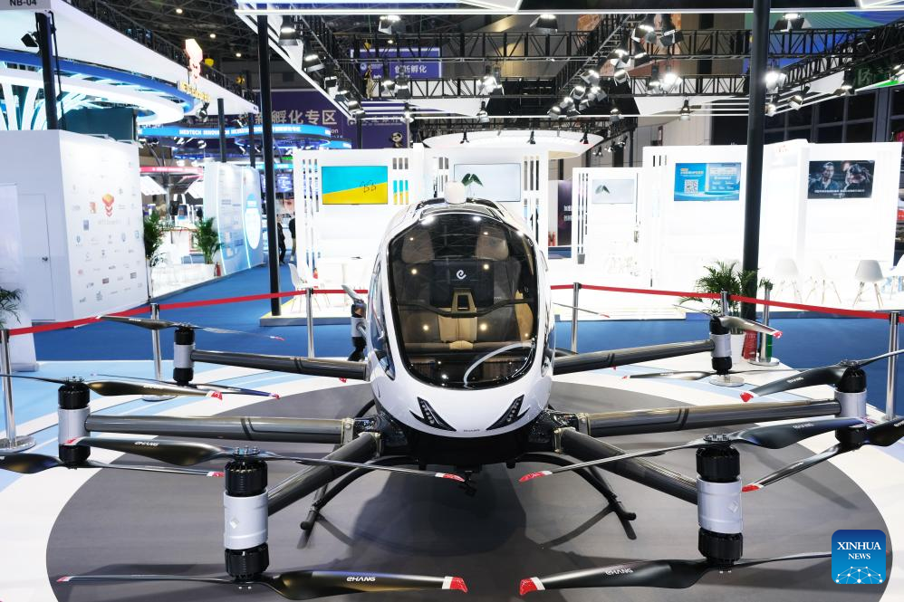 An electric vertical takeoff and landing aircraft is on display during the seventh China International Import Expo (CIIE) in east China's Shanghai, Nov. 5, 2024. The newest edition of the CIIE, the world's first national-level exposition dedicated to imports, opened on Tuesday in Shanghai. (Photo by Zhou Xinyi/Xinhua)