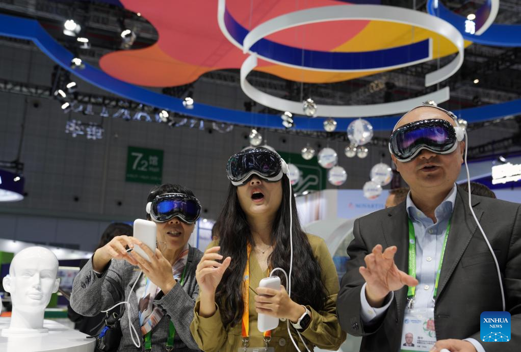 Visitors experience the process of radioligand therapy using AR technology at the booth of Novartis during the seventh China International Import Expo (CIIE) in east China's Shanghai, Nov. 5, 2024. The newest edition of the CIIE, the world's first national-level exposition dedicated to imports, opened on Tuesday in Shanghai. (Xinhua/Liu Ying)