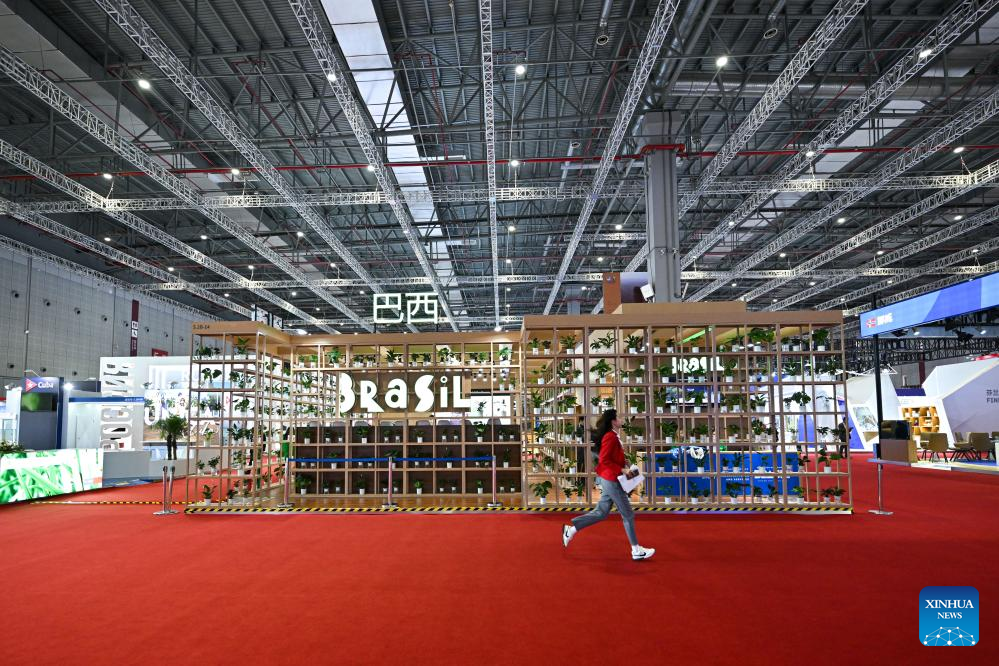 This photo taken on Nov. 5, 2024 shows the Brazil Pavilion during the seventh China International Import Expo (CIIE) in east China's Shanghai. The newest edition of the CIIE, the world's first national-level exposition dedicated to imports, opened on Tuesday in Shanghai. (Xinhua/Xin Yuewei)