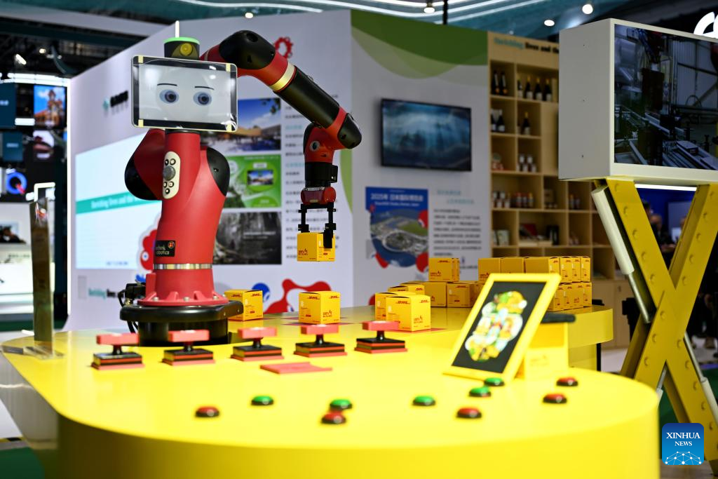 A sorting robot arm is on display at the booth of DHL during the seventh China International Import Expo (CIIE) in east China's Shanghai, Nov. 5, 2024. The newest edition of the CIIE, the world's first national-level exposition dedicated to imports, opened on Tuesday in Shanghai. (Photo by Chen Haoming/Xinhua)
