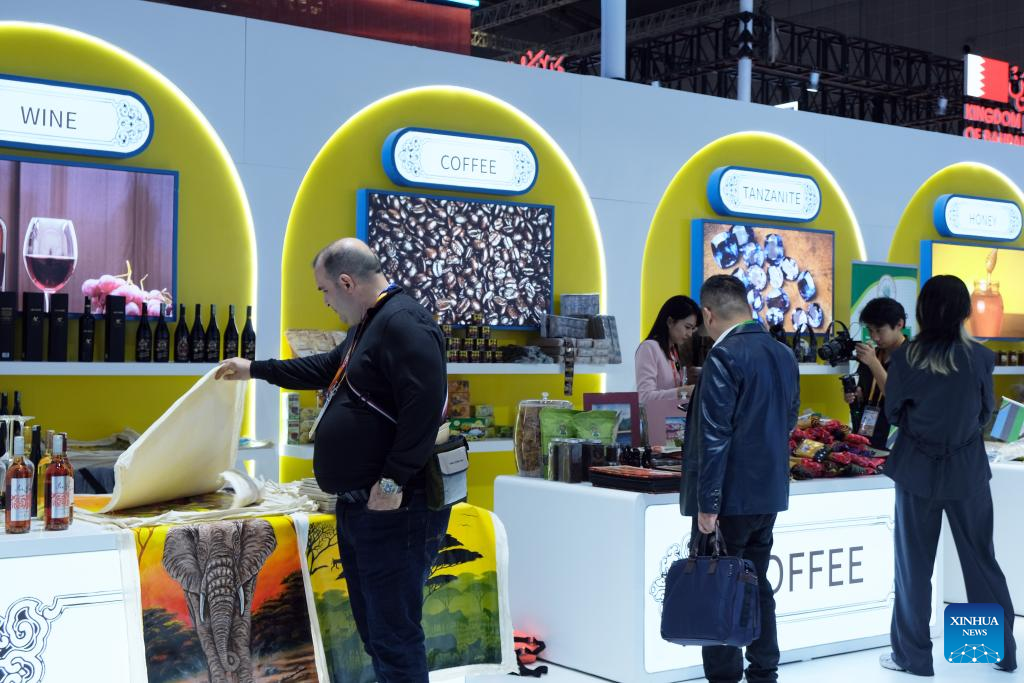 People visit the Tanzania Pavilion during the seventh China International Import Expo (CIIE) in east China's Shanghai, Nov. 5, 2024. The newest edition of the CIIE, the world's first national-level exposition dedicated to imports, opened on Tuesday in Shanghai. (Photo by Zhou Xinyi/Xinhua)