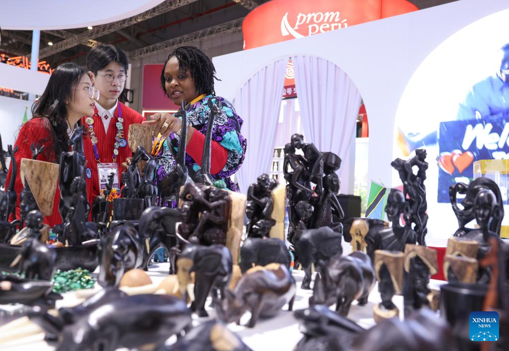 Visitors talk with an exhibitor at the Tanzania Pavilion during the seventh China International Import Expo (CIIE) in east China's Shanghai, Nov. 5, 2024. The newest edition of the CIIE, the world's first national-level exposition dedicated to imports, opened on Tuesday in Shanghai.