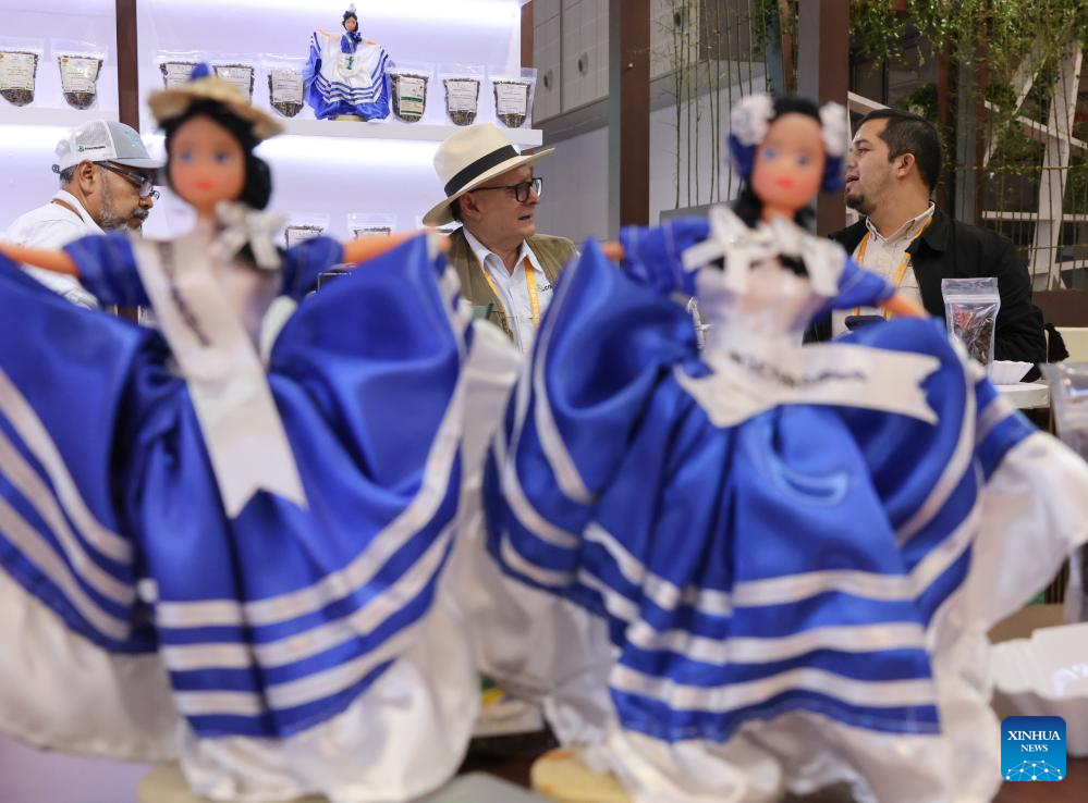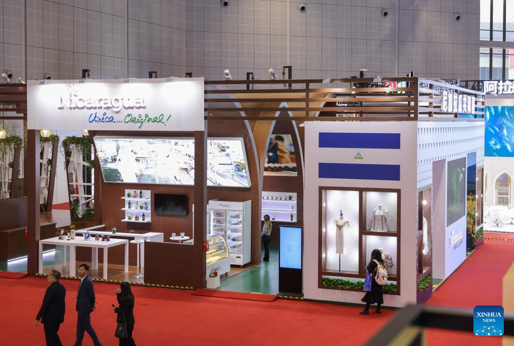 This photo taken on Nov. 5, 2024 shows the Nicaragua Pavilion during the seventh China International Import Expo (CIIE) in east China's Shanghai. The newest edition of the CIIE, the world's first national-level exposition dedicated to imports, opened on Tuesday in Shanghai.