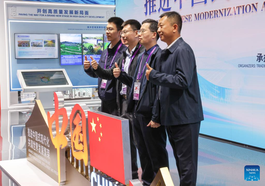 The China Pavilion, themed "Advance Chinese modernization and Jointly Pursue Global Development and Prosperity," focuses on showcasing the latest achievements in advancing China's modernization and high-level opening-up. (Xinhua/Du Xiaoyi)