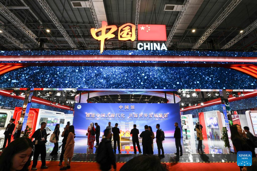 The China Pavilion, themed "Advance Chinese modernization and Jointly Pursue Global Development and Prosperity," focuses on showcasing the latest achievements in advancing China's modernization and high-level opening-up. (Xinhua/Yin Gang)