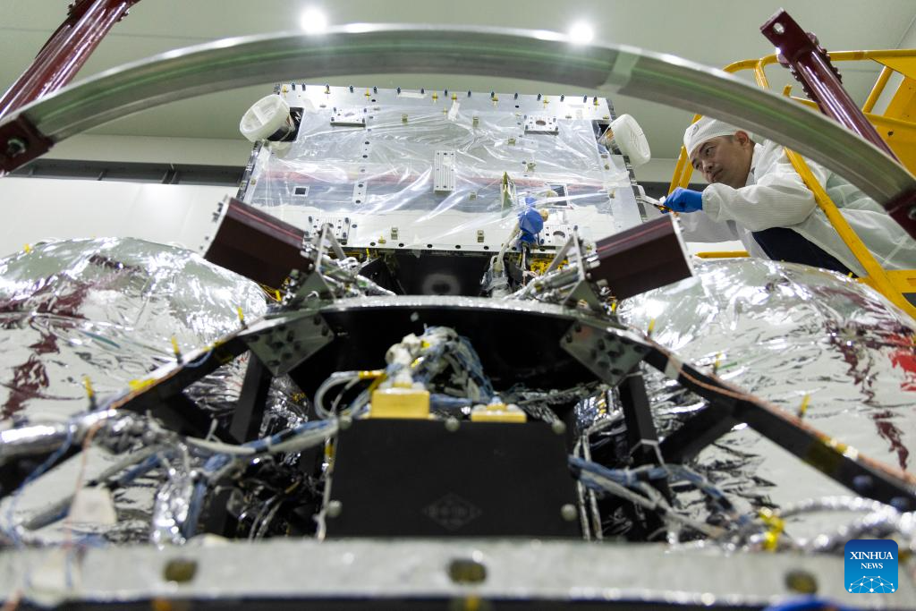 A technician checks the Solar wind Magnetosphere Ionosphere Link Explorer (SMILE) at a workshop of the Innovation Academy for Microsatellites of Chinese Academy of Sciences (CAS) in Shanghai, east China, Nov. 4, 2024. (Xinhua/Jin Liwang)