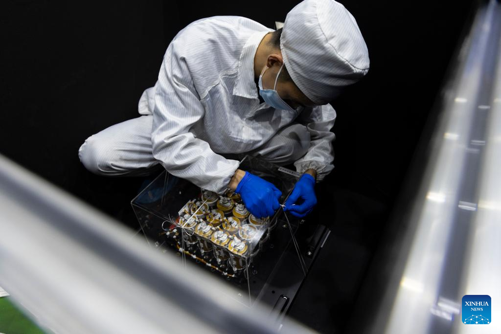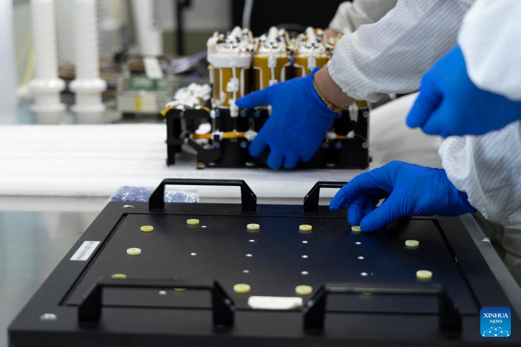 A technician packs the battery pack of the Solar wind Magnetosphere Ionosphere Link Explorer (SMILE) at a workshop of the Innovation Academy for Microsatellites of Chinese Academy of Sciences (CAS) in Shanghai, east China, Nov. 4, 2024. (Xinhua/Jin Liwang)