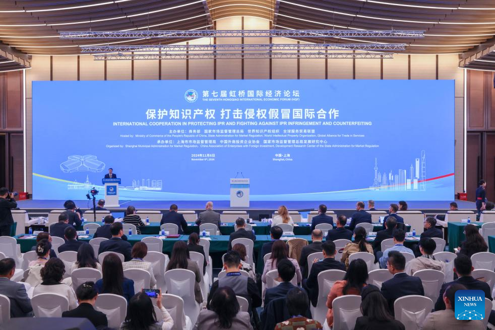 A sub-forum titled "International Cooperation in Protecting IPR and Fighting Against IPR Infringement and Counterfeiting" is held during the 7th Hongqiao International Economic Forum in Shanghai, east China, Nov. 6, 2024. (Xinhua/Yin Gang)