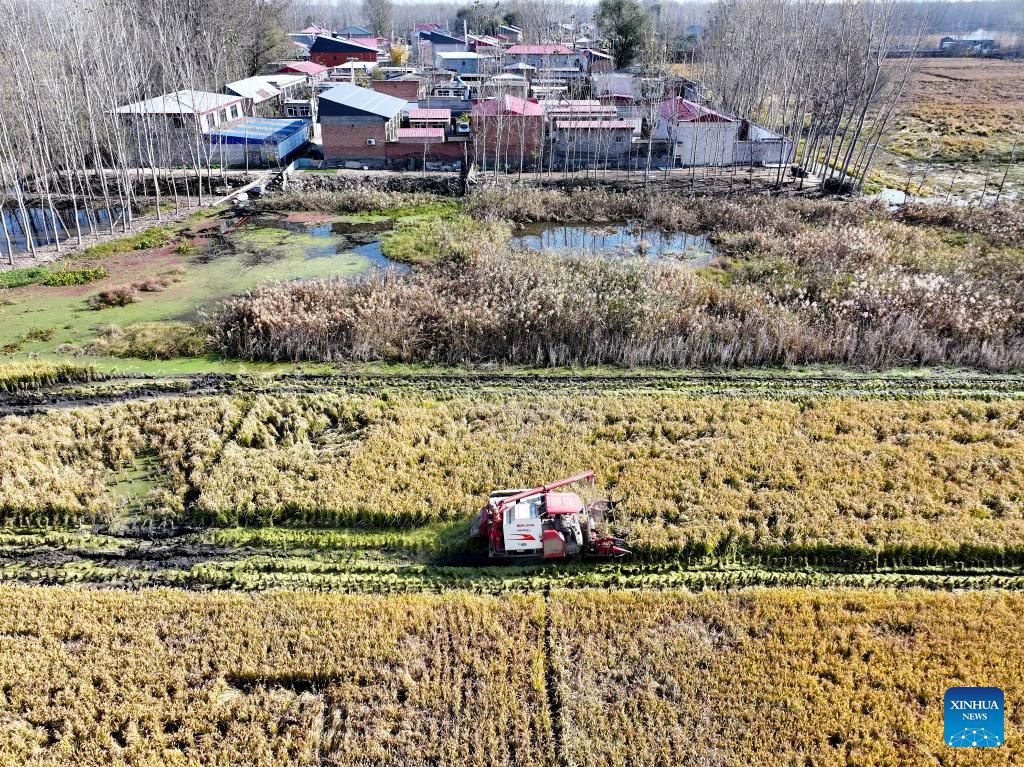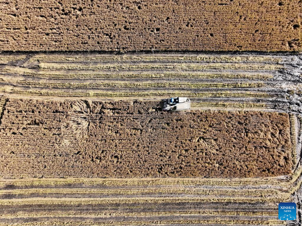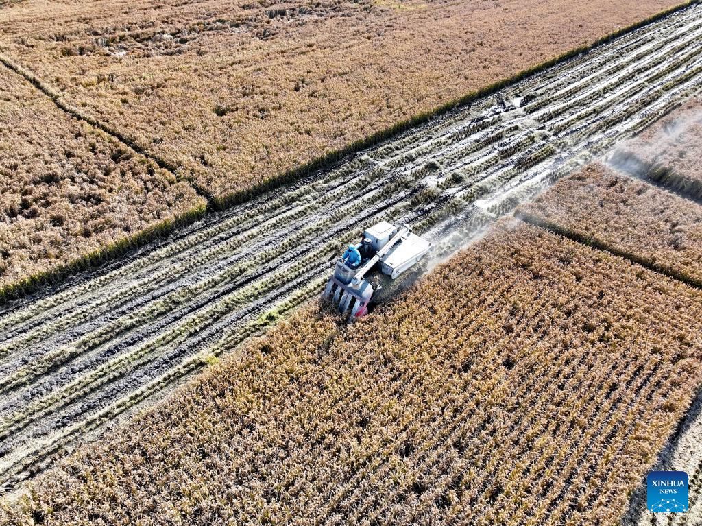 An aerial drone photo taken on Nov. 6, 2024 shows a harvester working in a paddy field in Xidoujiazhuang Village of Baichigan Town in Zhuozhou City, north China's Hebei Province. Zhuozhou City has a long history of rice cultivation. In recent years, relying on local agricultural business entities such as leading agricultural enterprises, cooperatives, and family farms, the local government has continuously cultivated and expanded the rice industry to enhance the popularity and market competitiveness of local rice brands, effectively increasing the income of farmers. (Xinhua/Mu Yu)