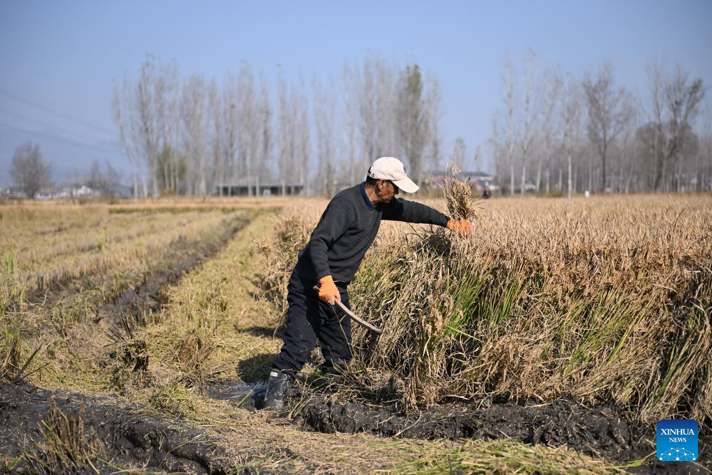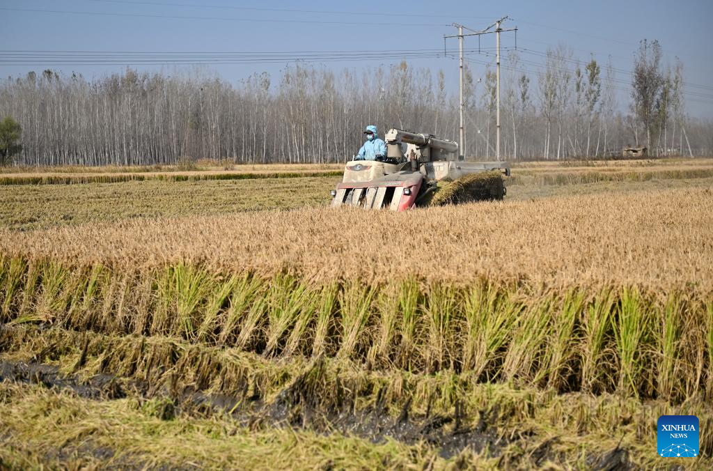 A farmer from a local planting cooperative harvests rice in a paddy field in Xidoujiazhuang Village of Baichigan Town in Zhuozhou City, north China's Hebei Province, Nov. 6, 2024. Zhuozhou City has a long history of rice cultivation. In recent years, relying on local agricultural business entities such as leading agricultural enterprises, cooperatives, and family farms, the local government has continuously cultivated and expanded the rice industry to enhance the popularity and market competitiveness of local rice brands, effectively increasing the income of farmers. (Xinhua/Mu Yu)
