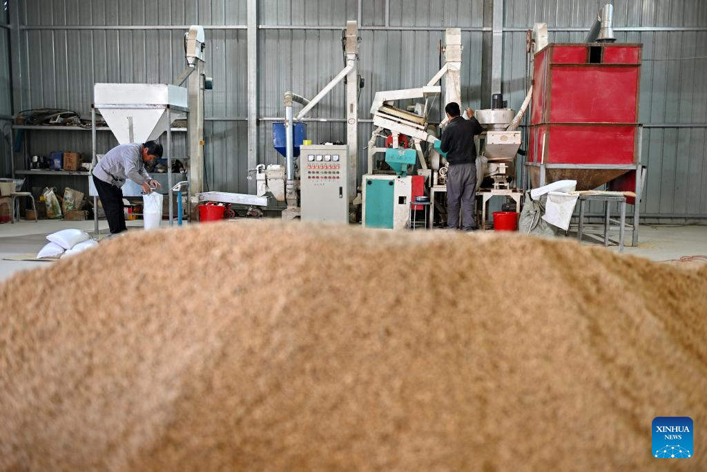 Farmers process harvested rice at a family farm in Zhuozhou City, north China's Hebei Province, Nov. 6, 2024. Zhuozhou City has a long history of rice cultivation. In recent years, relying on local agricultural business entities such as leading agricultural enterprises, cooperatives, and family farms, the local government has continuously cultivated and expanded the rice industry to enhance the popularity and market competitiveness of local rice brands, effectively increasing the income of farmers. (Xinhua/Mu Yu)