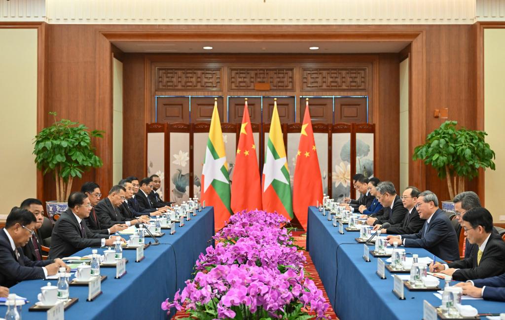 Chinese Premier Li Qiang meets with Myanmar's leader Min Aung Hlaing, who is in China for the eighth Greater Mekong Subregion Summit, in Kunming, southwest China's Yunnan Province, Nov. 6, 2024. (Xinhua/Yin Bogu)