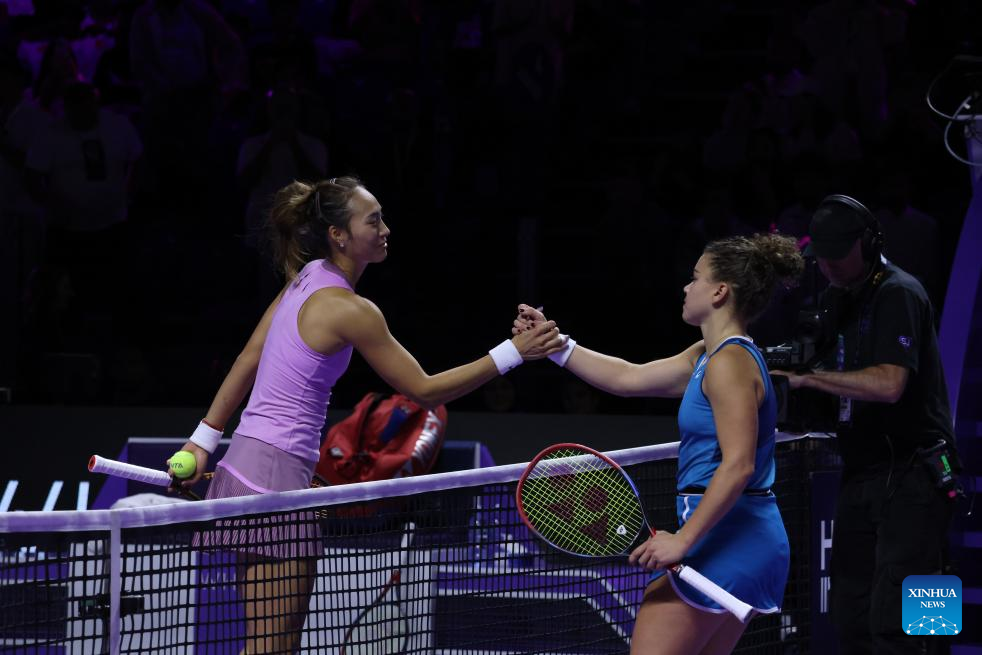 Zheng Qinwen (L) and Jasmine Paolini greet each other after the round robin match between Zheng Qinwen of China and Jasmine Paolini of Italy at WTA Finals tennis tournament in Riyadh, Saudi Arabia, Nov. 6, 2024. (Xinhua/Wang Haizhou)