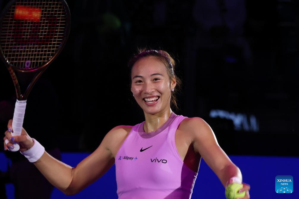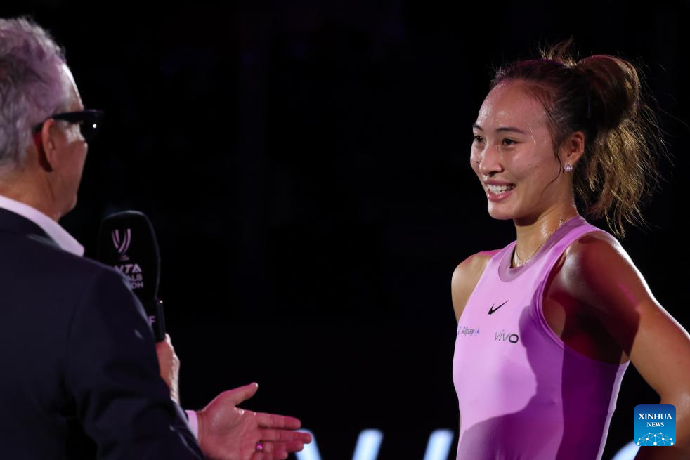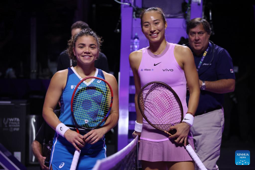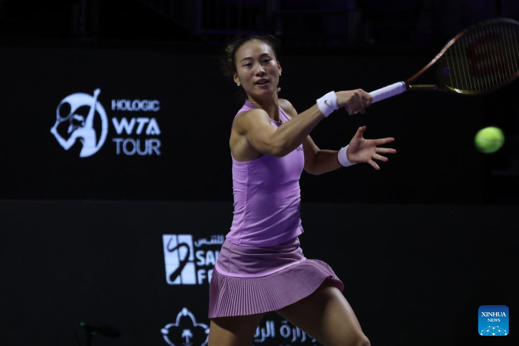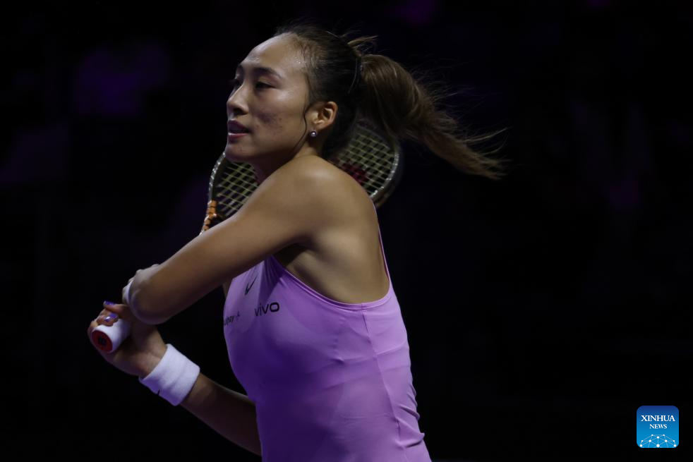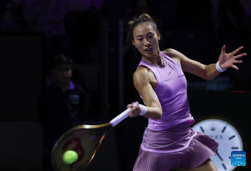 RIYADH, Nov. 6 (Xinhua) -- Paris Olympic gold medalist Zheng Qinwen of China cruised to a straight-set victory over Jasmine Paolini at the WTA Finals here on Wednesday, securing her spot in the semifinals.