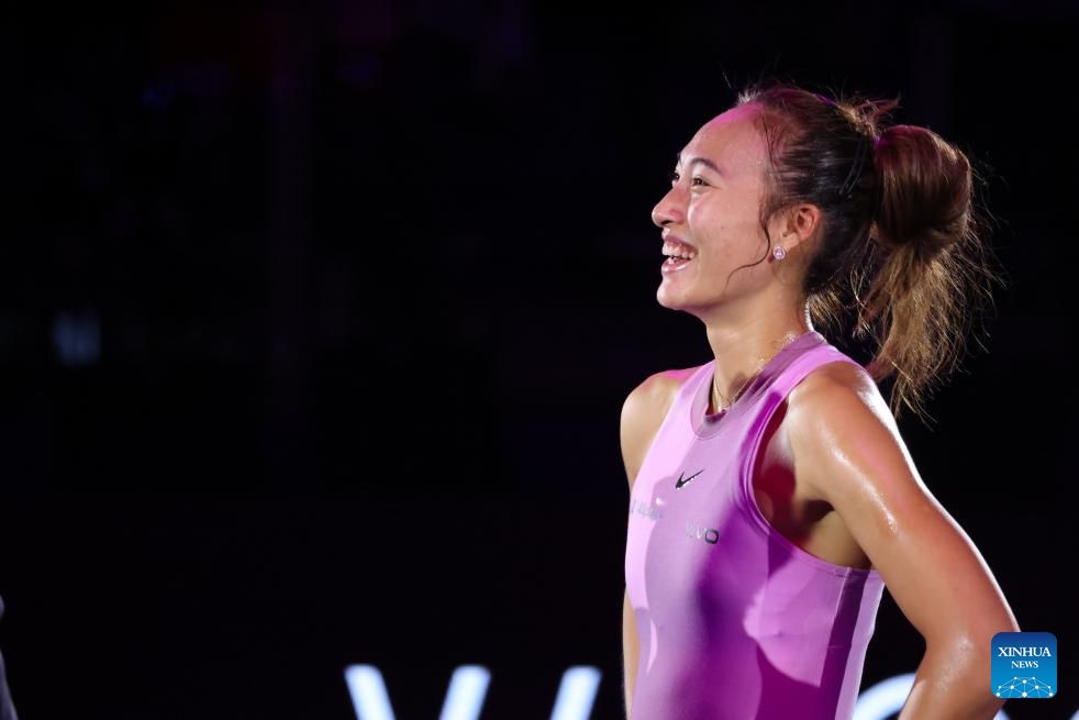 Zheng Qinwen waves to the spectators after the round robin match between Zheng Qinwen of China and Jasmine Paolini of Italy at WTA Finals tennis tournament in Riyadh, Saudi Arabia, Nov. 6, 2024. (Xinhua/Wang Haizhou)