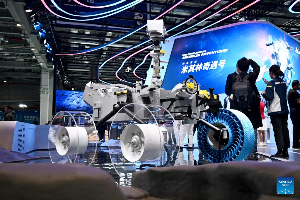 This photo taken on Nov. 6, 2024 shows a lunar rover tire of Michelin during the seventh China International Import Expo (CIIE) in east China's Shanghai. During the ongoing 7th CIIE, many new technologies, achievements and products met the public for the first time. (Photo by Chen Haoming/Xinhua)