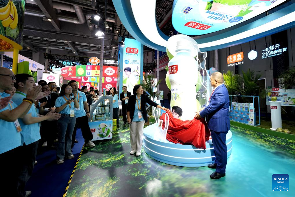 A new beverage product is launched during the seventh China International Import Expo (CIIE) in east China's Shanghai, Nov. 6, 2024. During the ongoing 7th CIIE, many new technologies, achievements and products met the public for the first time. (Xinhua/Zhang Jiansong)