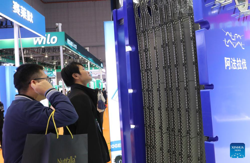 Visitors look at a semi-welded gasket plate heat exchanger at the booth of Alfa Laval during the seventh China International Import Expo (CIIE) in east China's Shanghai, Nov. 6, 2024. During the ongoing 7th CIIE, many new technologies, achievements and products met the public for the first time. (Xinhua/Fang Zhe)