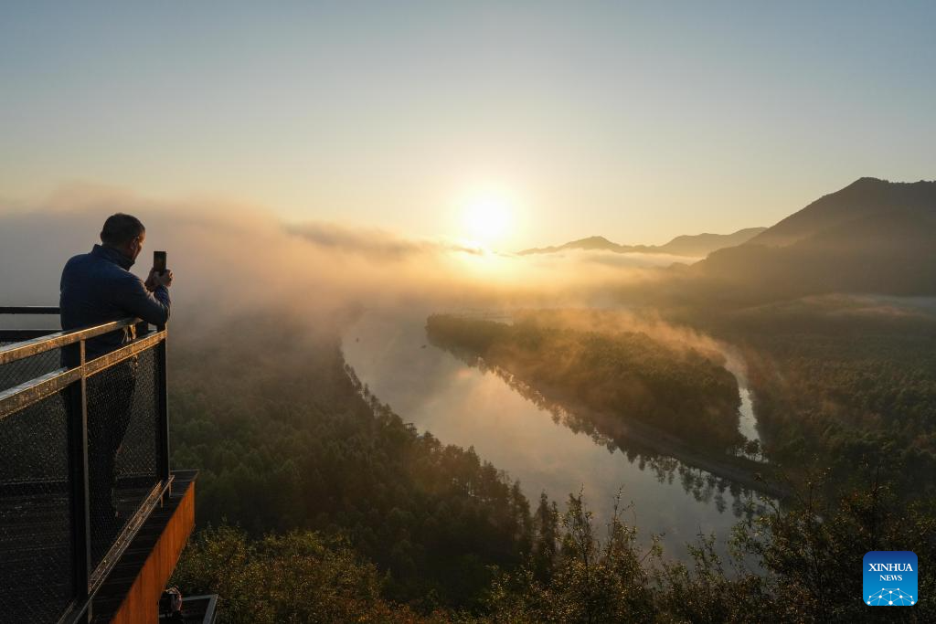 A tourist takes photos on a viewing platform during sunrise near a wetland park in Fangtang Township of Ningguo City, east China's Anhui Province, Nov. 7, 2024. (Xinhua/Chen Yehua)