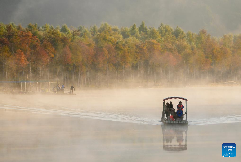 Tourists view bald cypress forests on sightseeing rafts at a wetland park in Fangtang Township of Ningguo City, east China's Anhui Province, Nov. 7, 2024. (Xinhua/Chen Yehua)