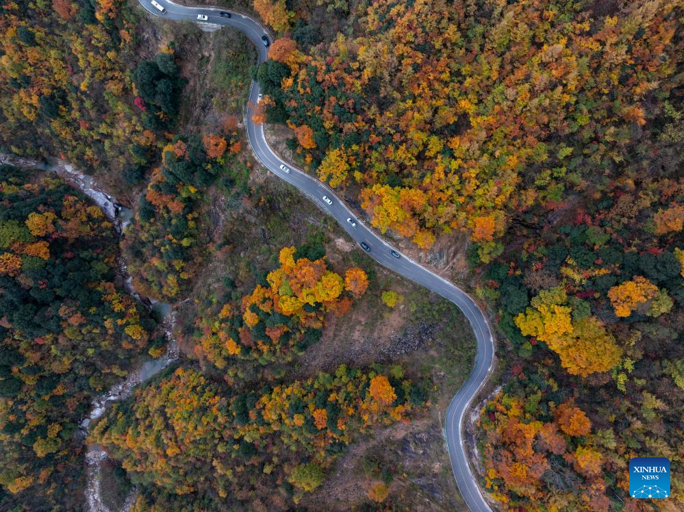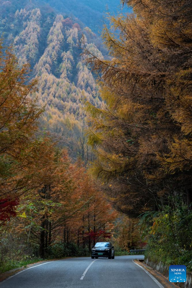 This photo taken on Nov. 6, 2024 shows a car running in Guangwu Mountain scenic area in Bazhong City, southwest China's Sichuan Province. (Xinhua/Jiang Hongjing)