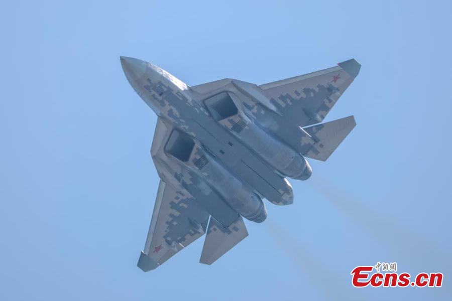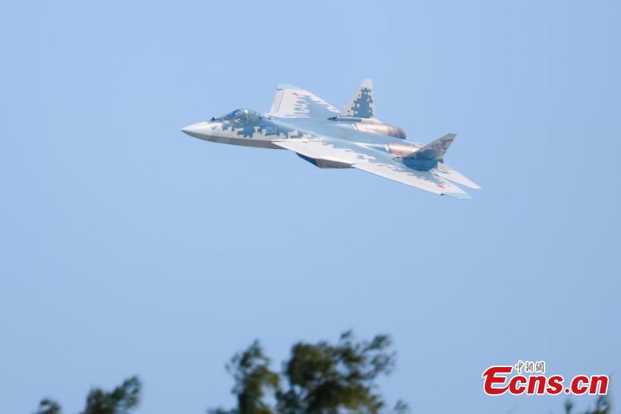 A Russian Sukhoi Su-57 stealth fighter jet conducts a test flight ahead of the 15th Airshow China at the Zhuhai International Air Show Center, south China's Guangdong Province, Nov. 7, 2024. (Photo: China News Service/Chen Jimin)