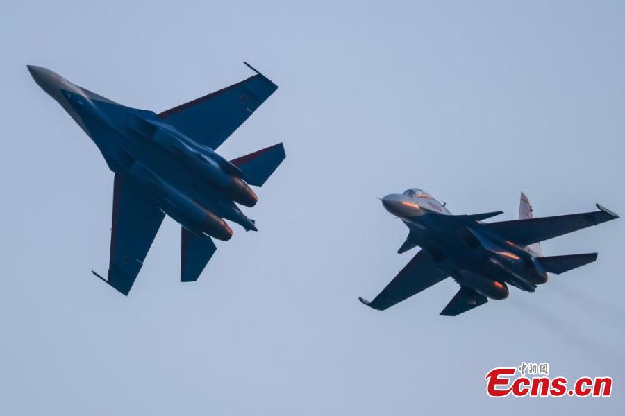 Six Su-35S heavy fighter jets and one Su-30SM fighter jet of the Russian Warrior Aerobatic Team arrive at the Zhuhai International Air Show Center, south China's Guangdong Province, Nov. 7, 2024. (Photo: China News Service/Chen Jimin)